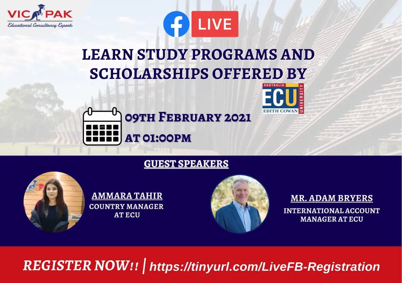 Find your potential by attending the ECU Edith Cowan exclusive information session. You will get to know about all kinds of study programs and scholarships available today that are lucrative. This valuable informative meeting will take place on the 09 th February 2021, on Tuesday. The session will start at 01:00 PM in the afternoon. Ammara Tahir is the guest speaker and is a country manager at ECU. Mr. Adam Bryers international account manager at ECU will also meet you. Future students are able to get professional advice in their higher education aspirations nowadays. VICPAK remains a great way to guide every Pakistani student to success.